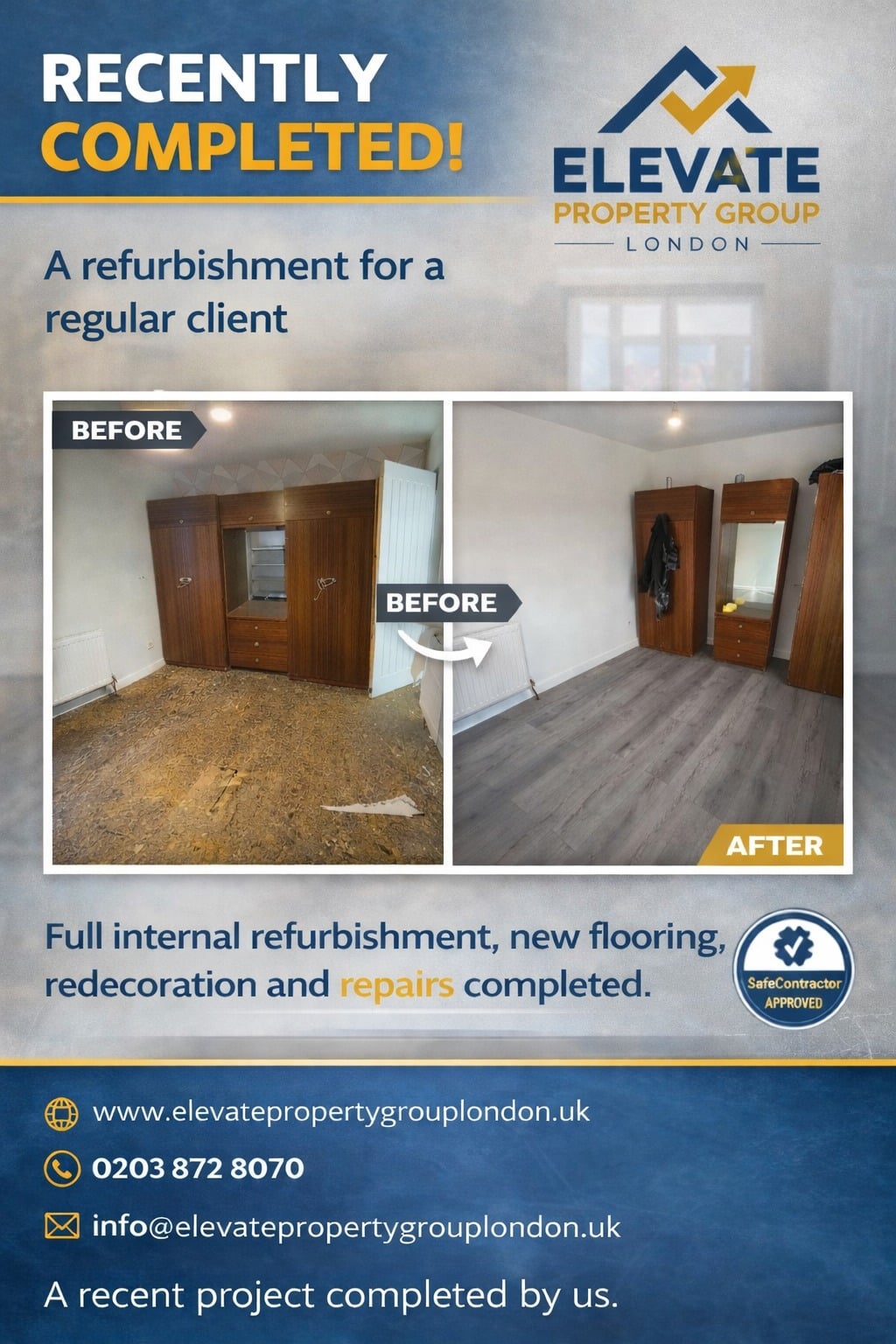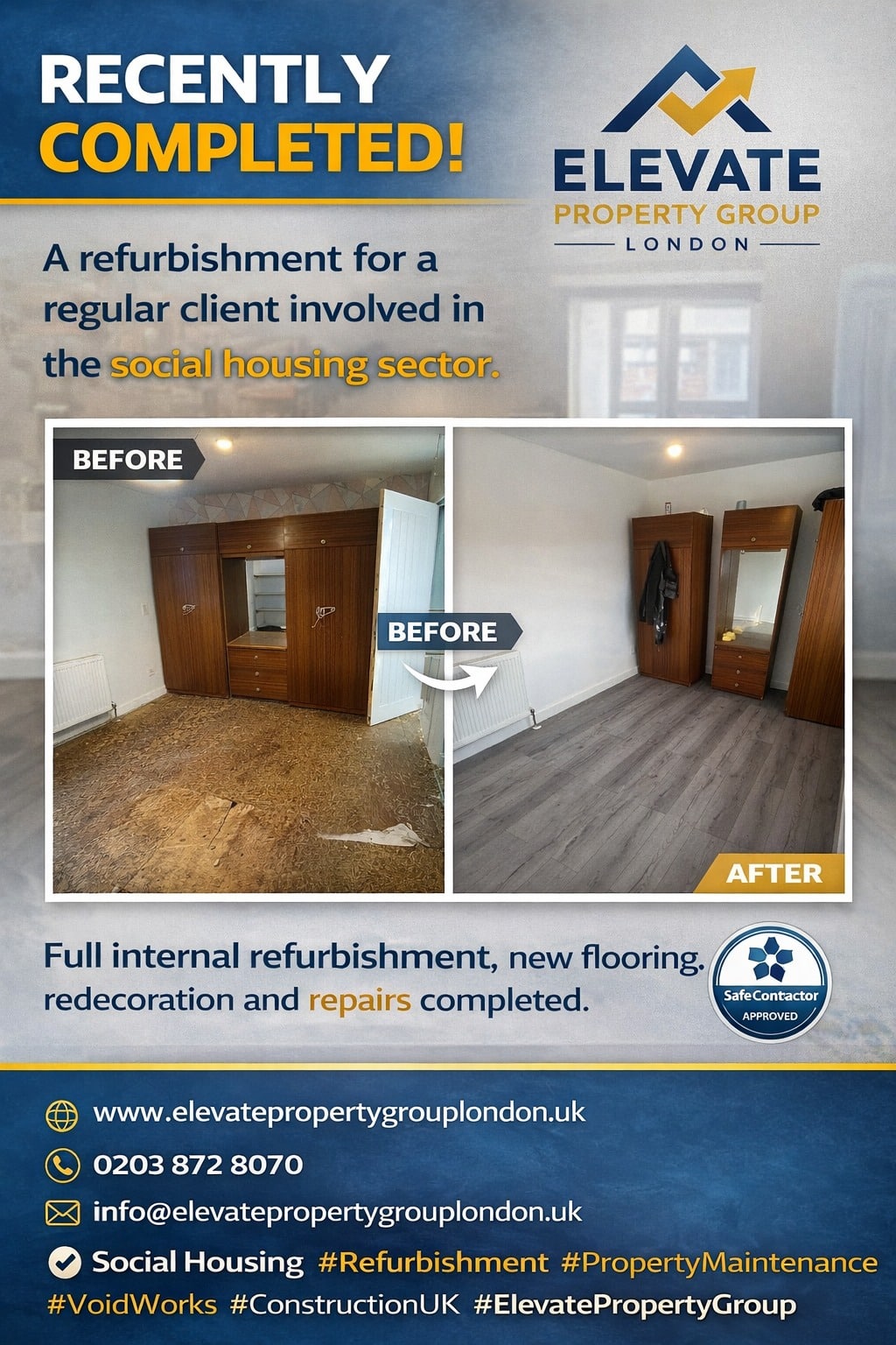 Elevate Property Group works with a wide range of clients across London, delivering reliable refurbishment, maintenance, and upgrade services for residential properties. Our team understands the different needs of landlords, housing providers, property professionals, and homeowners, allowing us to deliver efficient solutions that keep properties safe, compliant, and in excellent condition.